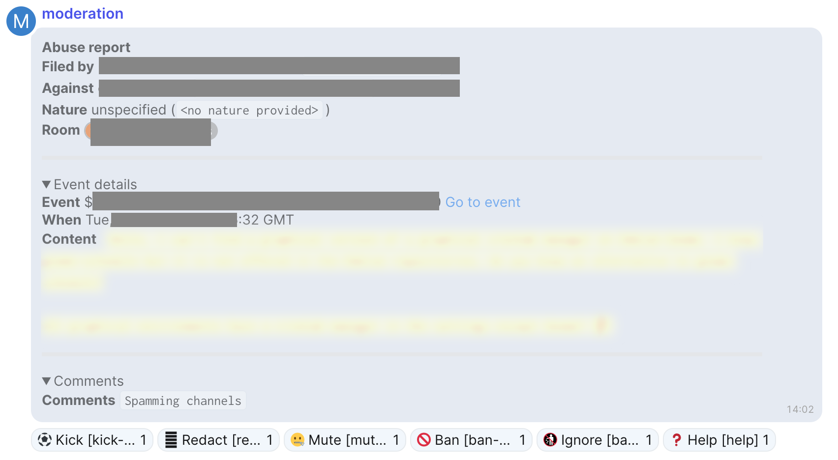 By default, the moderation reports go to the reporter's homeserver administrator. If you are the homeserver admin, you can choose to send the reports to the Mjolnir management room. Those reports look like this: