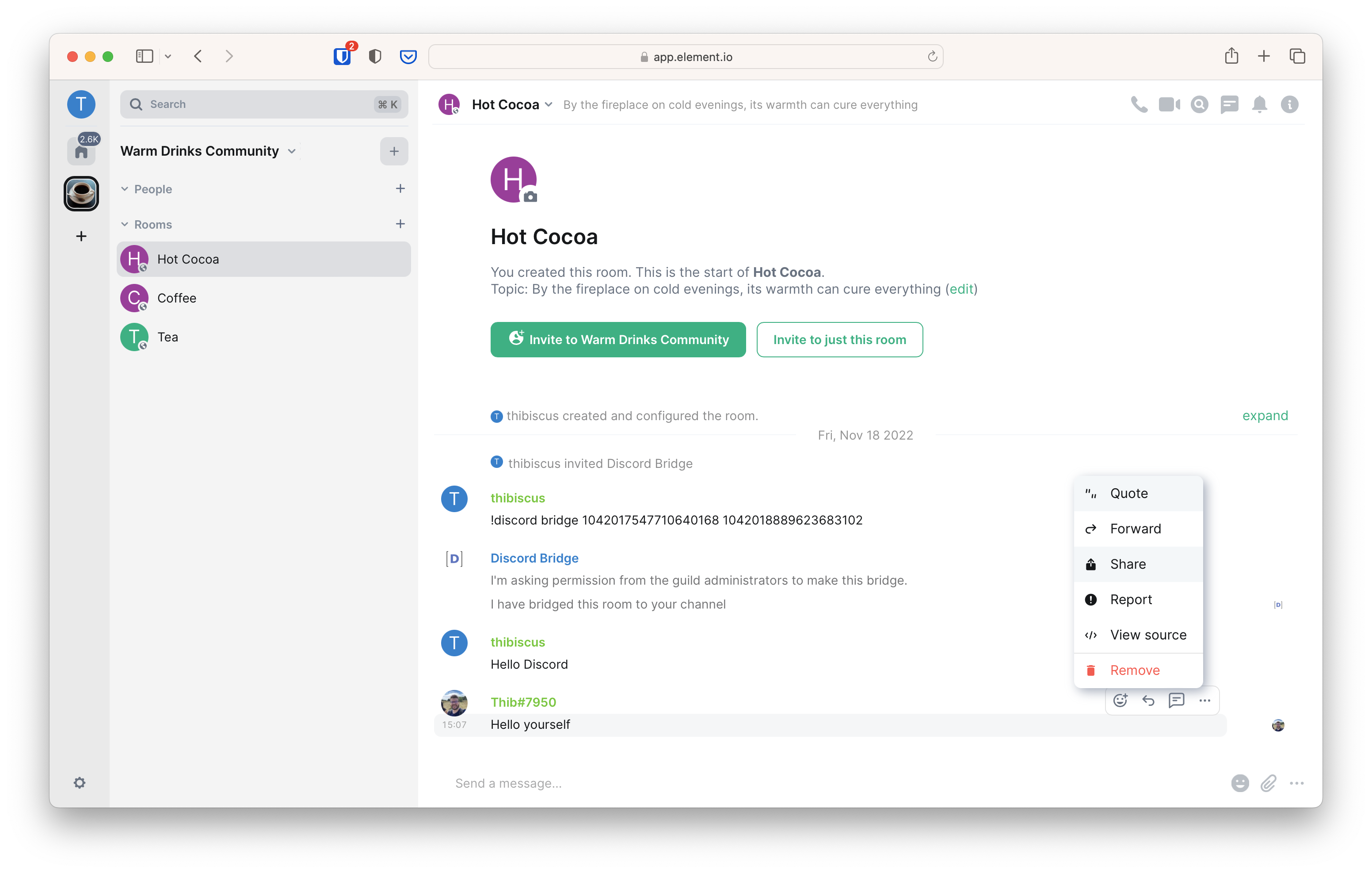 • Administrators can also change the history visibility (whether people can see messages from before they joined or not), enable encryption in the room, remove entire servers from the room, and promote others to Moderator or Administrator.